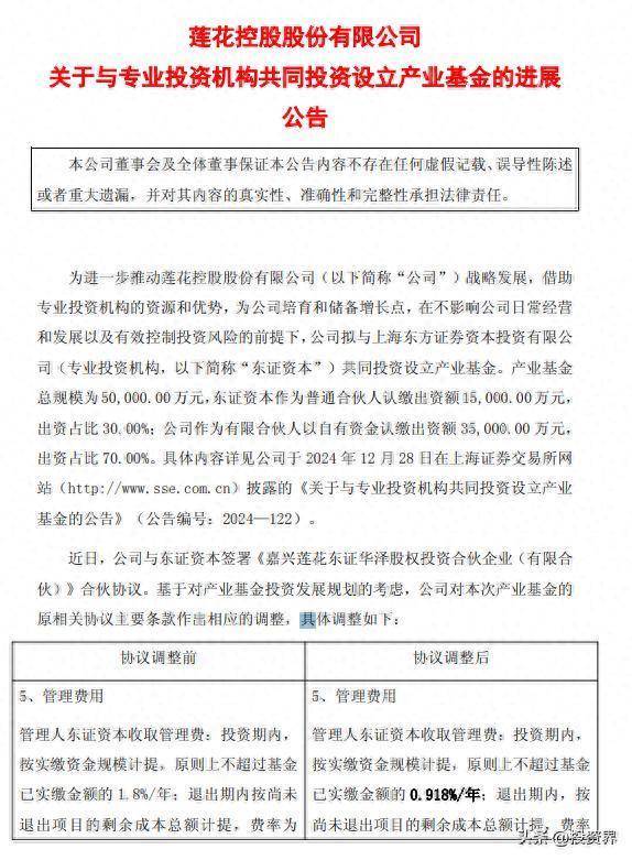 近日,公司与东证老本签署《嘉兴莲花东证华泽股权投资合资企业(有限合资)》合资条约。基于对产业基金投资发展观点的磋商,公司对本次产业基金的原干系条约主要条件作出相应的转念,包括不停用度、基金收益分派和投资有操办机制等。投资完成后,该产业基金将纳入公司并吞报表范围。