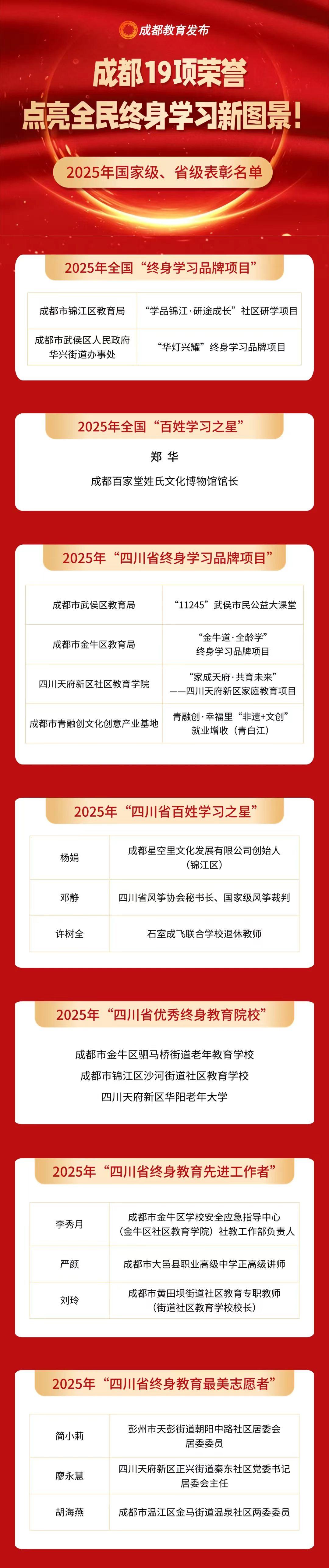 自2020年起,全市已运动举办5届全民毕生学习当作周,通过抑遏展示、典型犒赏、本性当作等多元形势,让毕生学习理念融入城市肌理。数据见证杰出式成长:2020至2025年间,成都累计栽种10名宇宙庶民学习之星、19个宇宙毕生学习品牌花式,省级层面斩获25个品牌花式、19名学习之星,市级层面暴露118个品牌花式、164名学习之星,构建起“国度-省-市”三级联动的荣誉矩阵,织密隐匿全民的毕生学习鸠合。