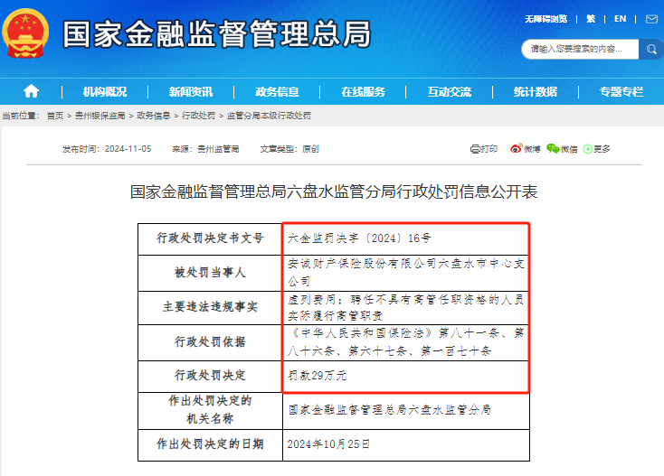 11月5日体育游戏app平台,国度金融监督惩办总局六盘水监管分局公开袒露了对安诚财产保障股份有限公司六盘水市中心支公司的行政处罚信息。